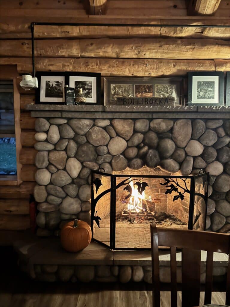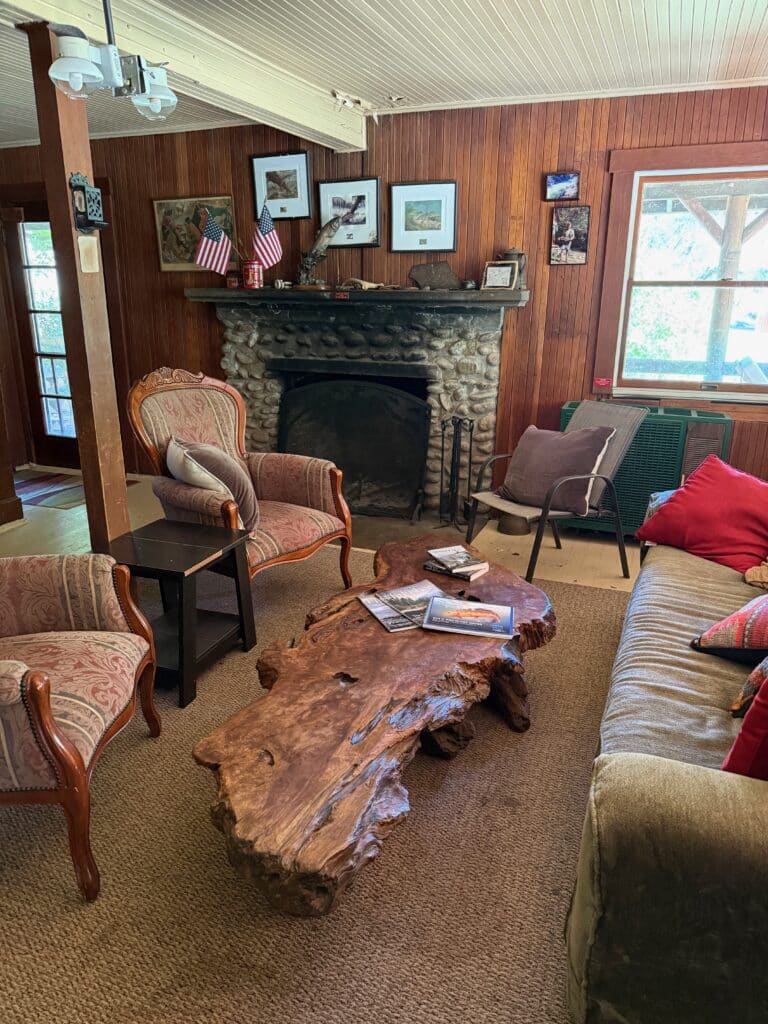 The preservation ethos extends to the lodges, each retaining the timeless charm of its 1920s build. Gas lamps adorn the walls—each must be lit, lovingly, by hand—alongside the nostalgic art expected of a fishing lodge: a sketch modeling the perfect cast, sun-bleached images of trout of lore, a fishing-adjacent New Yorker cartoon. A river-rock hearth in the dining room is topped with century-old black-and-white photos: hunters posing beside mountain lions, a reminder of Bollibokka’s early days as hunting grounds.