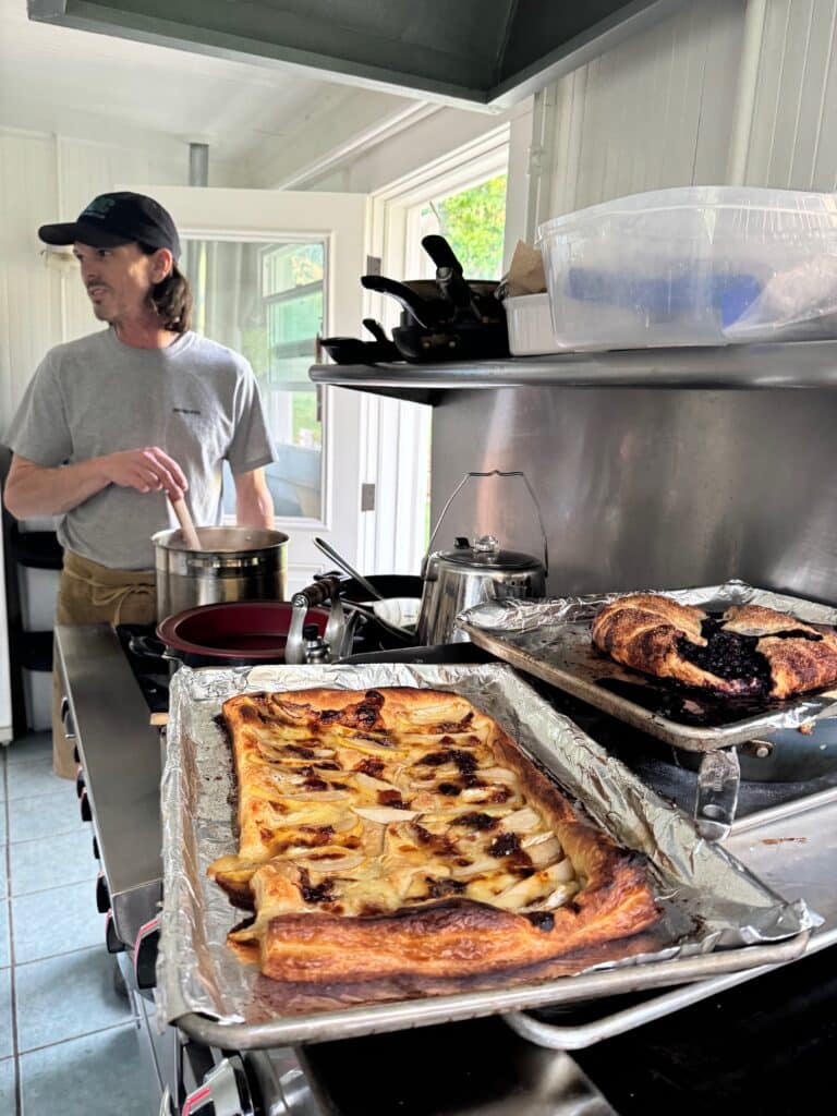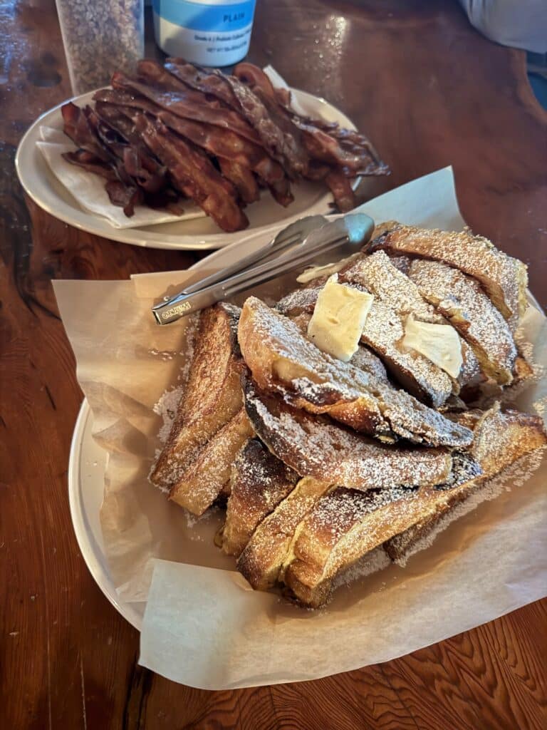 I wake up and follow the smell of coffee and maple syrup to a warm kitchen. Chef Ryan appears to be about seven courses into his day, jacketing thick cleaves of barbecue and sharp cheddar into torpedo rolls for pack lunches. A pile of bacon towers behind him, sourdough french toast soaks to his left, sliced fruit splays geometrically on a platter like a miniature city. I’m enjoying the amenities here. The two of us chat as we come into the morning, waiting for the others to shuffle in sleepy-eyed and hungry for a hot breakfast.