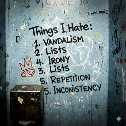 Years ago, there was a meme I liked that circulated online, featuring a list of “Things I Hate” scrawled on a bathroom wall. I’ll lean on AI here to re-create it—and to add its own unintentionally funny AI-hallucinated twists that I’ll let you play “What’s wrong with this picture?” with, like in the old Highlights magazines in a pediatrician’s waiting room. Spoiler alert: There was nothing wrong with those pictures because they were all fantastical cartoons. So yeah, perfectly fine for a goat to be standing in a tree. They do yoga with humans now, too, you know.