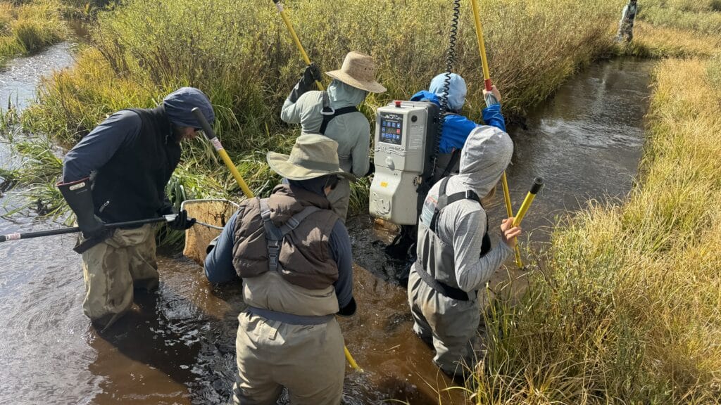 By 8 a.m. each chilly morning, we’d prep breakfasts and lunches, then hit the trail to the first of two reaches we’d be efishing. The reach would be subjected to eDNA testing before we could confirm whether goldens were the only resident fish (ahem, we’re keeping our eyes on you, non-native brown trout). For clarification, a reach is about 100 meters long, measured off and contained with block nets to keep the water flowing while retaining the fish. We would shock the area in 3 or 4 passes, depending on how many fish we retrieved each time. Throughout the day, we played various roles: following the efisher and netting the shocked fish, holding the bucket to deposit the fish, running it to the processing station for measuring and weighing, and recording the data. The fish (only goldens!) were placed in holding pens until the survey was done, then released with minimal trauma into the stretch they were collected from. Afterward, we’d move the equipment to the next reach and start again. It’s fairly straightforward, but these were long, grueling days of hard work, often returning to camp as the sun set for a starlit dinner. Rinse and repeat. It was a grind, but a good one.