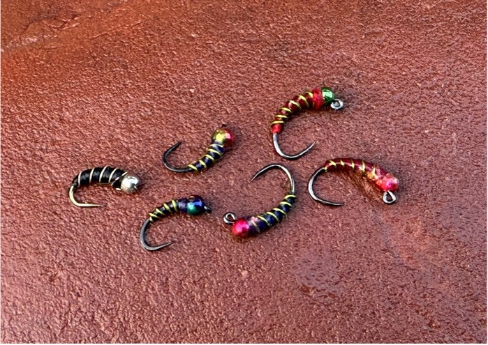 Curtis’s 1st zebra midge (left) and some later variations. Photo by Curtis Fong