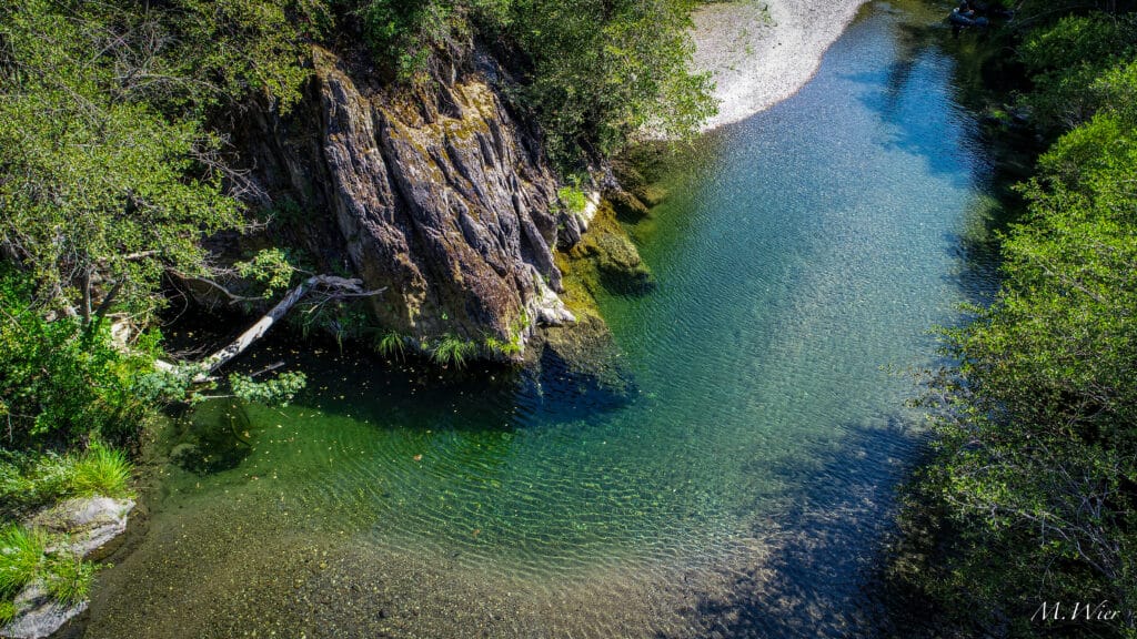 The water pushes wide and brown after winter storms. Gravel bars braid and reform. Trees are tipped over, dragged downstream, stripped of their limbs and bark, pushed, rolled, and pushed again. Between storms and in spring, the water clears to green as flows drop. In summer, the river recedes into long riffles and bedrock pools. Ever changing.