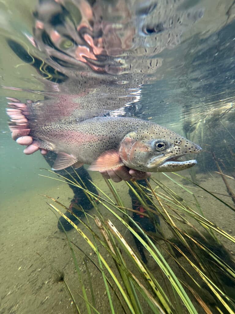 Not to imply that the Williamson is an easy fishing river, but in fact, it’s incredibly technical. While the fish don’t seem to be terribly concerned with actual fly colors or maybe size, fly behavior and action are critical. The Upper Williamson is gin clear and slow-moving, so sneaking up on holes is advantageous. Several times, I crept up to a hole thinking I was in a perfect position, only to watch 15 fish scatter before me as my head cleared the grass, revealing the absurdity of my approach. Long, gentle presentations and long drifts are the norm. The almost universal mantra that a “drag-free drift” as the pinnacle of fly dry fly fishing holds true. Except when it doesn’t. A dry fly presented cleanly on top might not get a bite, but what we started to call the “Yamsi Twitch”—a clean presentation and drift, followed by a slight pull or shake of the rod to give the fly a little action like a dying bug, followed by a quick retrieve would often result in an aggressive strike somewhere in there where a straight drift yielded no results.