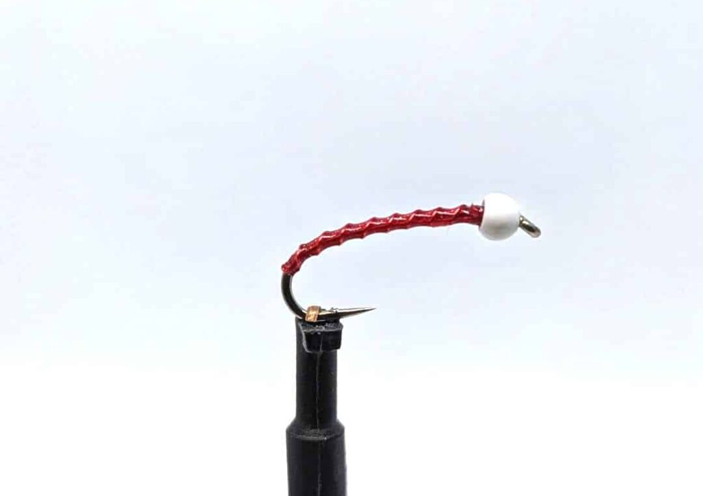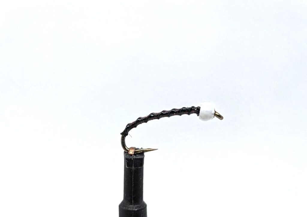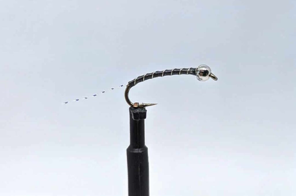 I reached out to several guides and shop owners around Crowley Lake, asking them to share their knowledge. The morning Kirsten and I were fishing with Joe Contaldi, I asked him what his favorite midge fly was. He laughed and said, “The one I have tied on.” I saw that coming. I stripped in my fly line and looked at the midge flies he had rigged on the rod. There was a Tiger Midge with a Krystal Flash tail and a Gray Midge. Joe usually ties his own midges, and they’re not a set pattern. Like many guides, he puts an individual twist on common flies. The Tiger Midge features a copper tungsten bead, a black-thread body, and a copper wire rib. In some circles, this fly is called a Copper Top Midge. Joe’s version had a single strand of pearl Krystal Flash as a tail. The other fly was a Gray Midge with a black tungsten bead, a gray thread body, a silver wire rib, and a single strand of Krystal Flash tail.