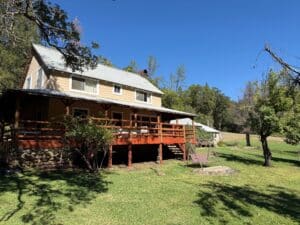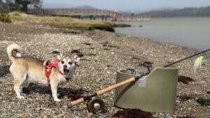 We have carried this fun idea forward in the Gold Country Fly Fishers by having a f ireside “preparty” where something interesting is cooked outdoors the night before our big tri-tip barbeque and potluck on the last night of our Davis Lake June outing chasing the damselfly nymph migration. We meet again at a smaller Frenchman Lake gathering in the fall, always with some guitar pickings as the fire burns down. I mentioned a leg of lamb suspended on a chain from an iron cooking triangle in the May/June 2020 Foraging Angler column. Other memorable meals have included goat on the chain. We bring the spit for an entire beef loin, a 14-pound pork loin wrapped with prosciutto, and we cook rabbit marinated in and basted with a vinegar-based Basque marinade on a grill suspended by the triangle chain over coals.