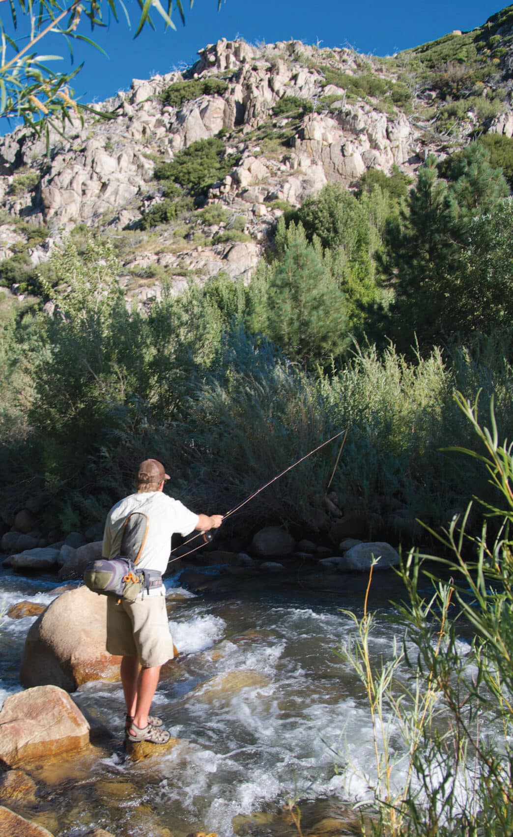 On occasional headwaters explorations, I break out the ultralight gear, usually picking a 2-weight or 3-weight in the 7-to-8-foot range. For the rest of the river, I prefer an 8-1/2-foot 4-weight. A 9-foot 5-weight will certainly suffice, but it is overkill for everything in the West Carson except throwing double nymph rigs in the deep bridge pools for stocked brutes. Because of the river’s small size and relatively shallow streambed, I almost never turn to streamers or sink-tip lines. A floating weight-forward line appropriately matched to your rod will cover 99 percent of the opportunities found here. Short tapered leaders approximately 7-1/2 feet in length do the job for pocket-water stretches, while 9footers are the ticket for the meadow and deeper pools. Tippets of 4X and 5X will cover most situations, with the occasional need for 6X with small dries.