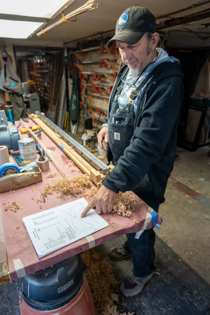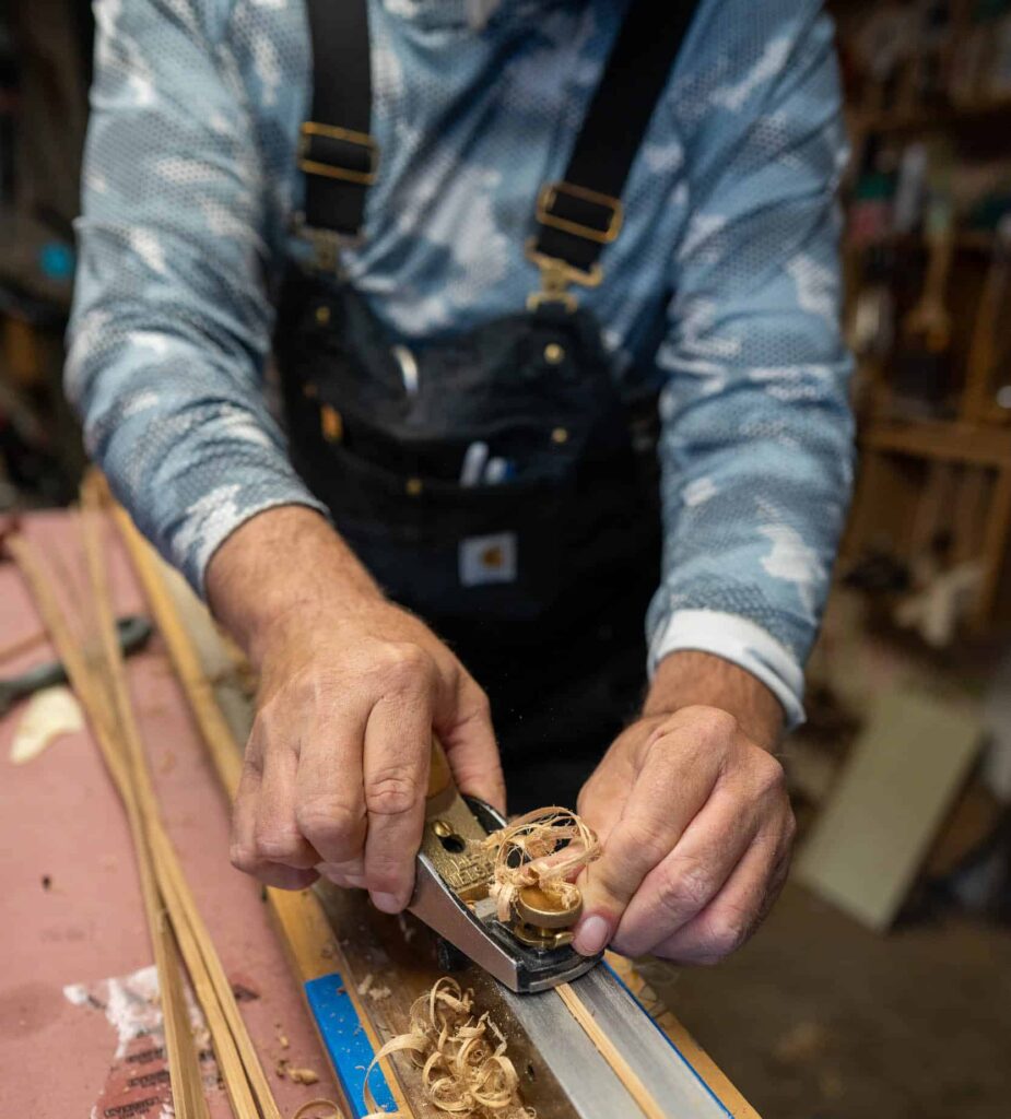California Fly Fisher publisher Tracey Diaz joins me in the shop for a plaining demo. Tony, in overalls, already covered in sawdust, lays a strip of cane into a metal form and begins running a planer back and forth over it. Bamboo curls up and falls away, onto the bench and the floor. Soon, we’re all bathed in shavings. The form is the visual highlight of cane rod making. It’s essentially two long, metal blocks, each with a groove cut into the edges on both sides. To create a fly rod taper, a builder will adjust the two form pieces together to an exact taper from wide to narrow, from one end to the other—this is the secret story every individual rod only reveals when you put a line on it and cast. How the pieces are measured is based on historical taper designs, taper blends, and input from the rod builder. Each of the six pieces must be shaved down perfectly so they fit together properly when glued up.