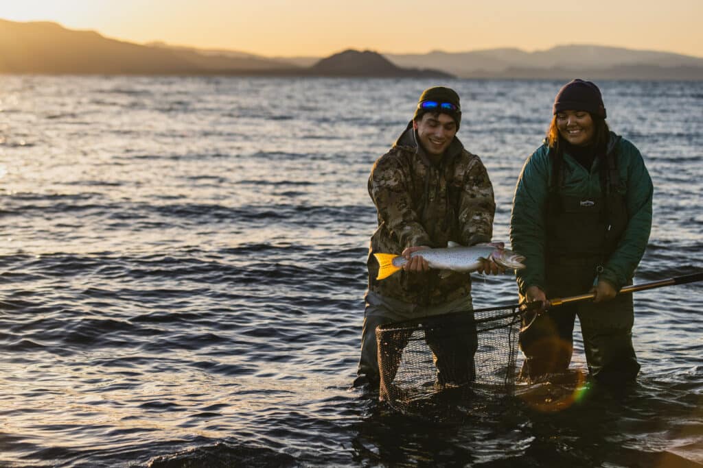 Pyramid Lake guide Autumn Harry netting a Lahontan cutthroat trout for her client. Photo by Ryan Cleek