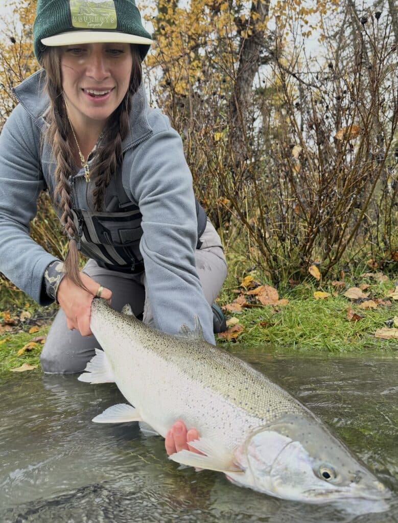 Leslie Ajari Messett, who guides for steelhead on the Rogue, the North Umpqua, and along the Oregon Coast, has spent over a decade building her career on the water. “Finding a client base for swinging for steelhead takes some time,” she said. “I’m pretty easygoing and focus on process-based instruction and creating a good experience for my clients.” She has gained confidence and a steady clientele by explaining the why behind each fly, cast, presentation, and why it’s a good run, while hyping up her clients. She works hard to curate a memorable day for everyone she guides.