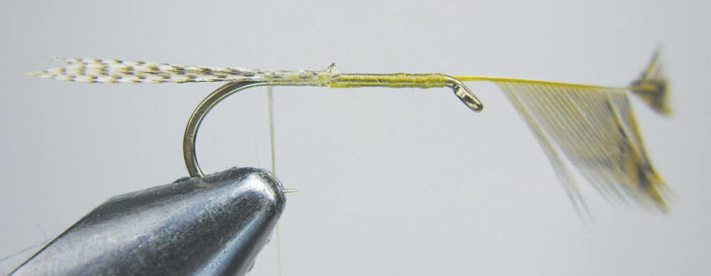 Step 4: At the root of the tail, tie in two pheasant tail fibers.