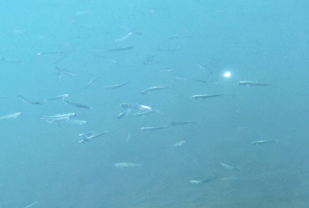 The fishing flotilla was patiently waiting for the Almanor hex hatch to start. A school of smelt swam by the boat, so, naturally, the GoPro was lowered into the water. The camera faced west, which meant there wouldn’t even be the sun’s residual red sky glow to reflect off their sides. Remarkably, the smelt still flashed quite noticeably and were visible from several feet away. The difference between the overhead sky (reflected by the fish’s sides) and the background water was enough to make the fish visible. Trout would have no trouble locating the school under these conditions.
