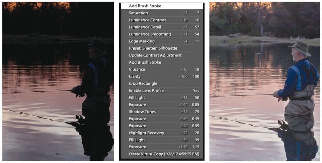 This topic is too big to cover in detail. In general, editing begins with making global adjustments, especially straightening horizons, cropping, adjusting color, tone, contrast, and saturation, and sharpening. Then, if your desire, skills, and software package support it, you can make local adjustments on specific parts of the image. On the next page is an example of how editing can improve a photo. I start with an underexposed image of a friend fishing a lake at sunset, followed by a screenshot of the edits I applied in Adobe’s Lightroom 3 RAW editor, and then the final image, which retains the drama of the sunset while bringing out some of the details in the angler and surrounding forest.
