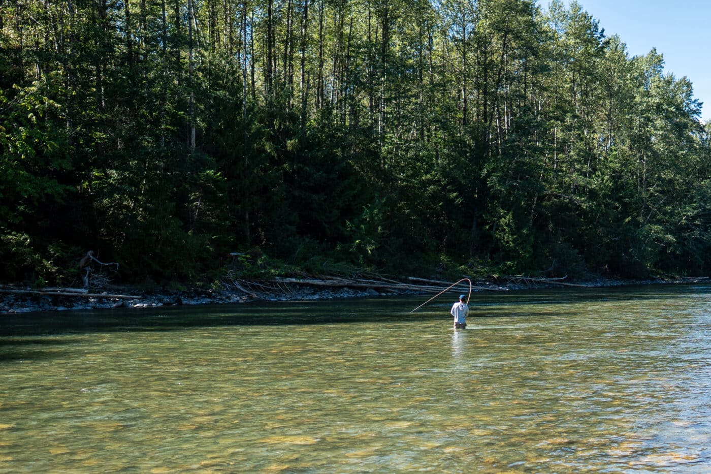 Having a stealthy cast is essential when targeting summer steelhead in low, clear water. You want to cast in a way that allows your leader to extend fully while not ripping on the water’s surface during the setup or smashing down on delivery. Often, a straight-line cast quartered downstream will do the trick. My preferred casts when targeting summer steelhead are the Snake Roll and Single Spey. They offer incredible power and control with minimal setup noise on the water when compared to the Snap T or Double Spey. Additionally, these two “touch-and-go” casts are more time efficient and allow you to cover more water during a fishing session.