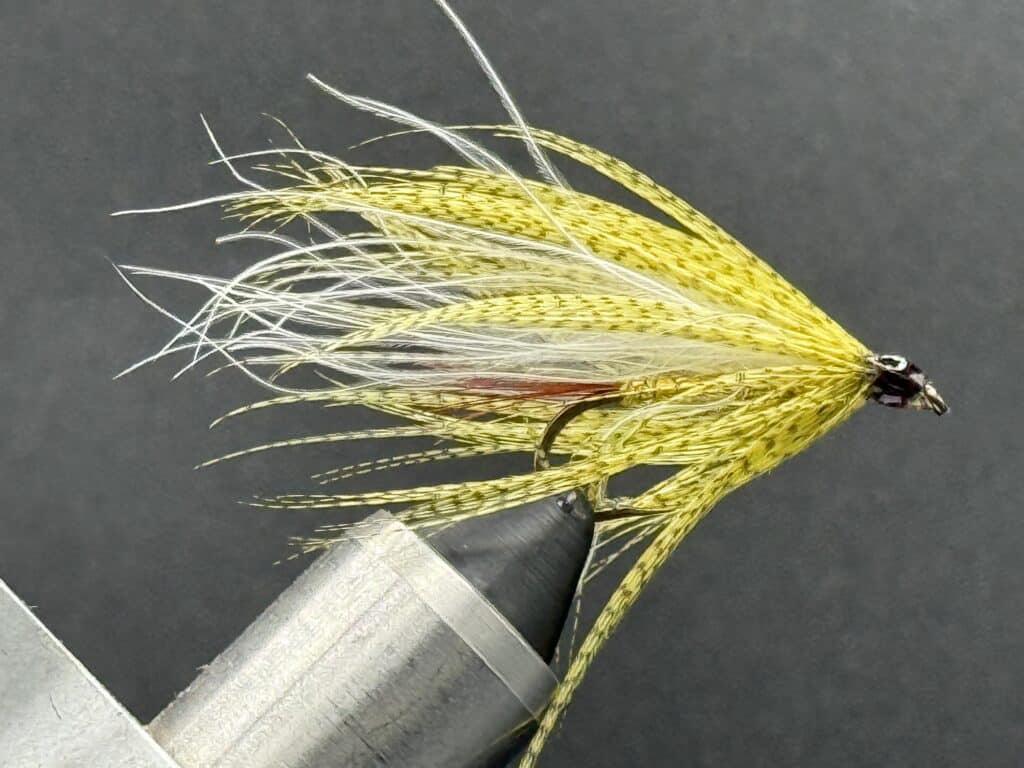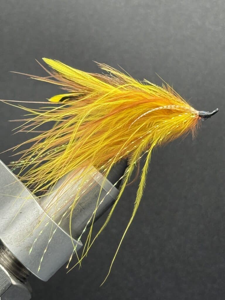 Tying tips: The tail is tied such that it extends one-half to one-third of the shank length past the bend. The body is simply yellow floss with tinsel ribbing. The marabou is tied in on top, just in front of the body, and the mallard is wound around the shank in front of and over the marabou.