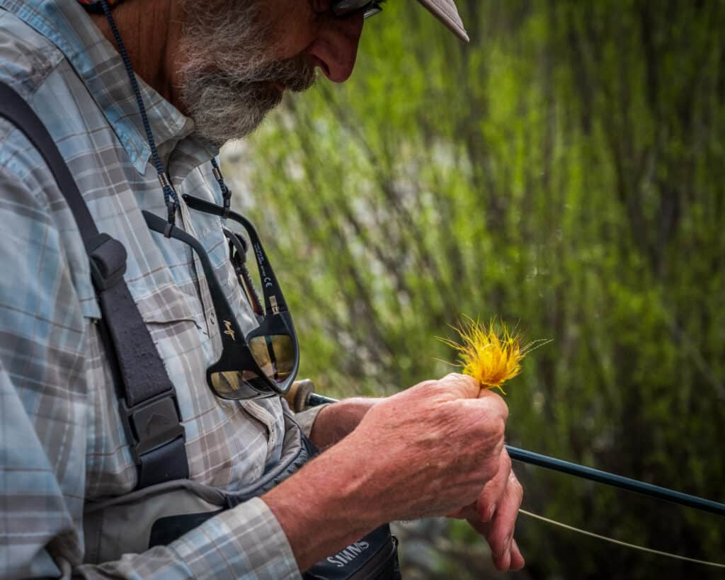 I tie on the Platte River Spider first. There are brown trout in this reach, and I want to test if the orange and yellow hues of this spider will trigger one of the big fish we have found here. I pitch the line into the current and let it swing into the seam 50 feet down; I pull in and cast again. On the third swing, I feel an abrupt jerk, then slack. It’s a break-off. A break-off of the only Platte River Spider that I have.