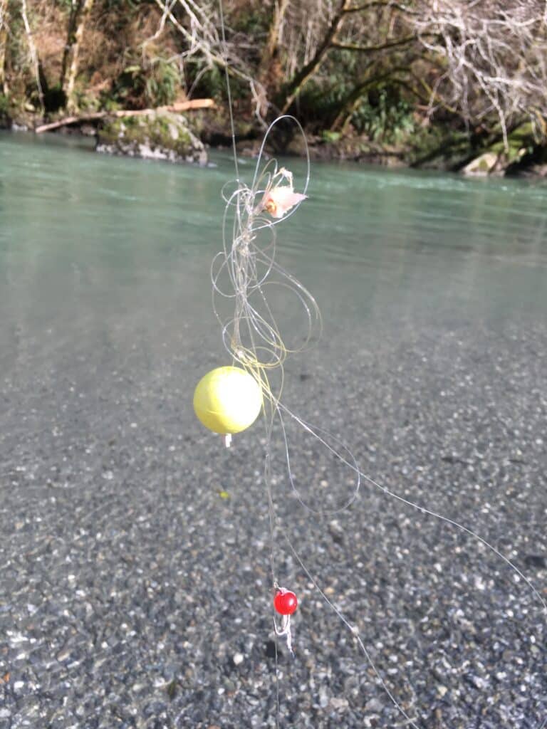 If the tangle is really bad, all three of these elements might be tangled. If so, start with the indicator, if you can. Then do the weight, then the flies. Sometimes, it helps to take the indicator off, if possible, and then put it back on when the tangle is freed.